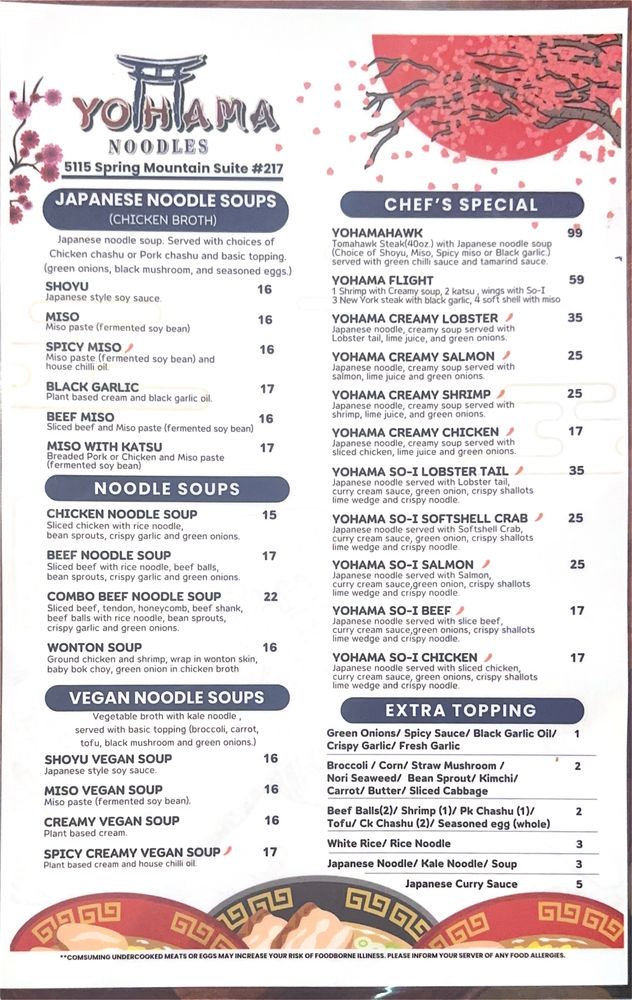 Welcome to the culinary oasis of Yohama Noodles, a delightful haven located in the bustling Pacific Asian Plaza at 5115 Spring Mountain Rd #217, Las Vegas, NV 89146. Here, Asian flavors converge in a noodle-centric menu that pays homage to traditional and contemporary ramen dishes.