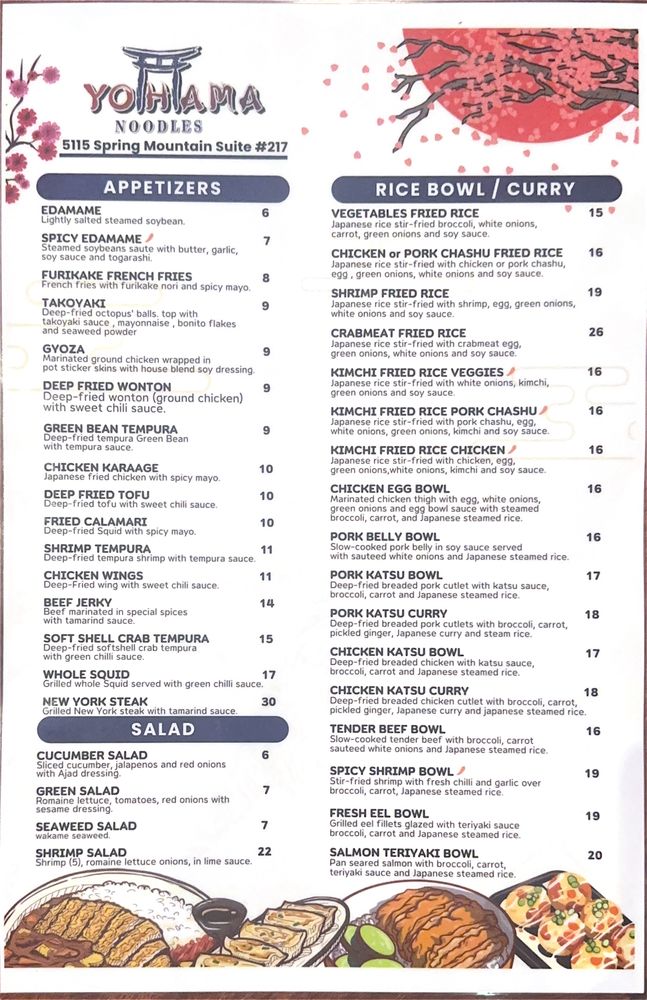 Welcome to Yohama Noodles, located in the heart of Pacific Asian Plaza, Las Vegas. This cozy noodle bar brings a delightful twist to traditional ramen with a menu that caters to all tastes, featuring both savory and refreshing options.